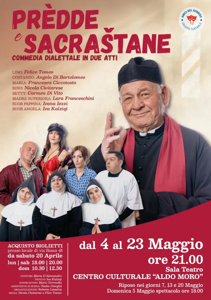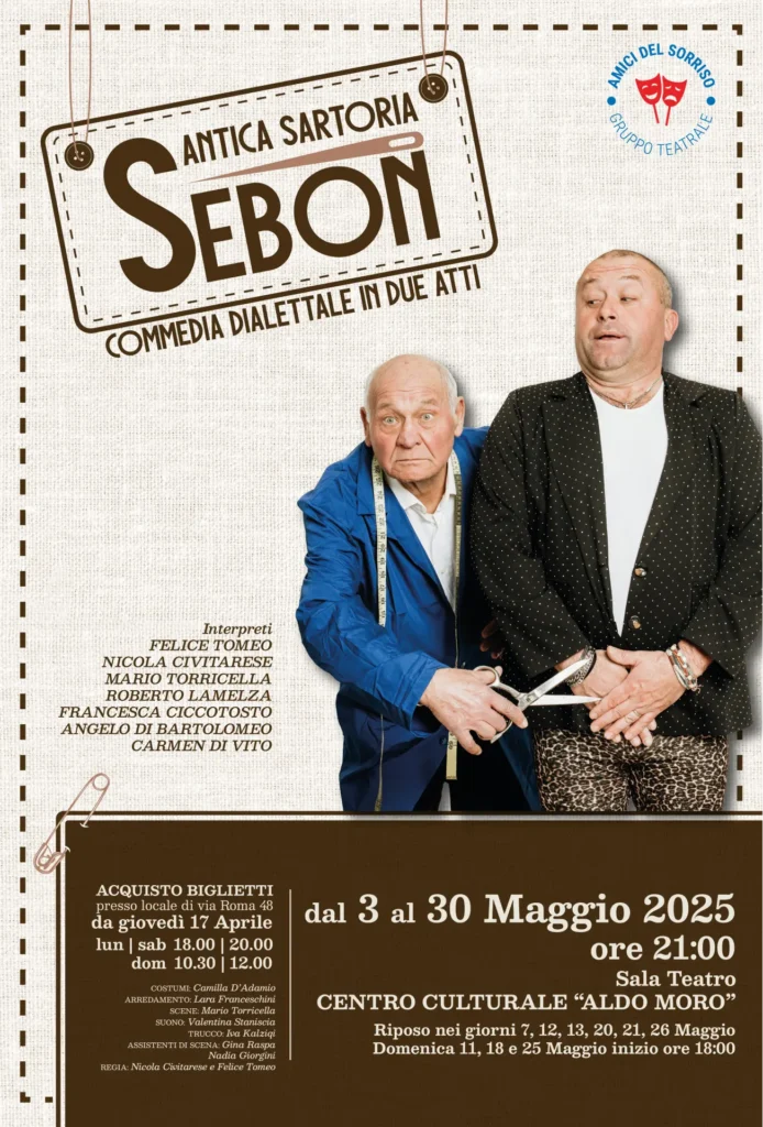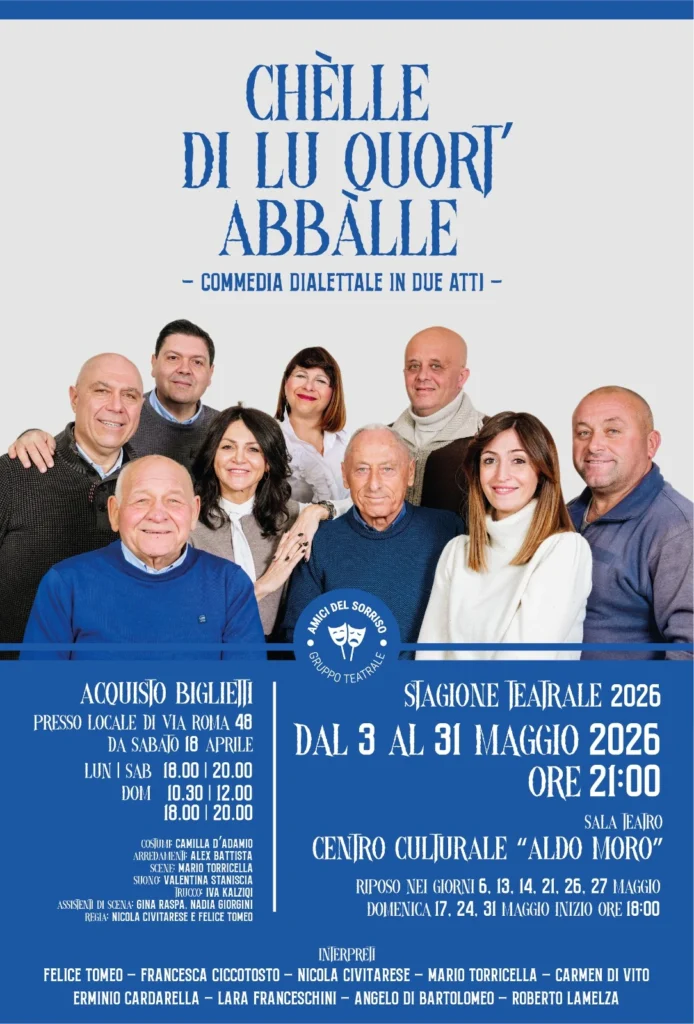 Siamo gli Amici del Sorriso, un gruppo teatrale nato nel 2023 dalla profonda passione di tre amici: Nicola Civitarese, Felice Tomeo e Mario Torricella. La nostra avventura teatrale non nasce dal nulla; i nostri percorsi si sono già incrociati e formati nella Compagnia di teatro Sperimentale “Renato Bevilacqua”, dove abbiamo condiviso palcoscenici e imparato l’arte di raccontare storie.